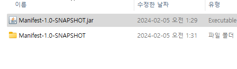 META-INF에 MANIFEST.MF 파일이 생성된 것을 확인할 수 있는데, 메모장을 열어 확인 시