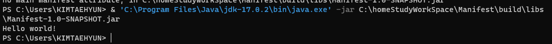& 'C:\Program Files\Java\jdk-17.0.2\bin\java.exe' -jar C:\homeStudyWorkSpace\Manifest\build\libs\Manifest-1.0-SNAPSHOT.jar