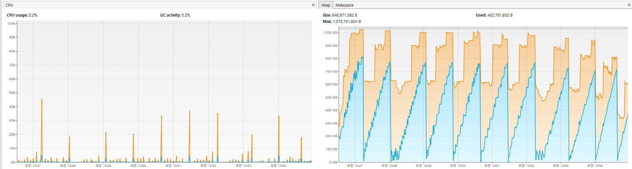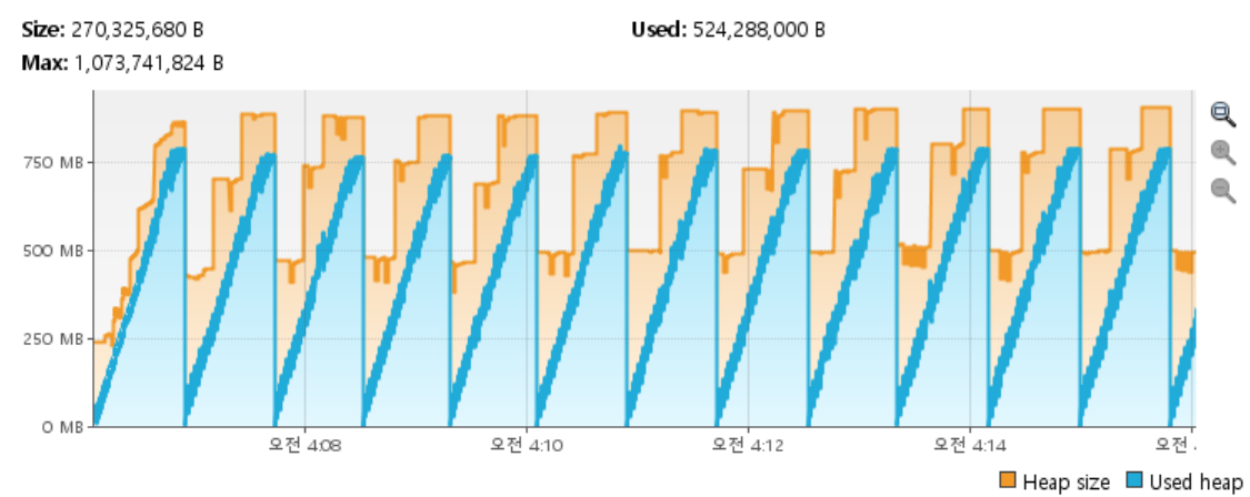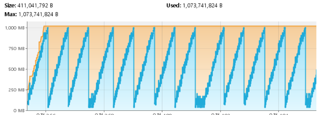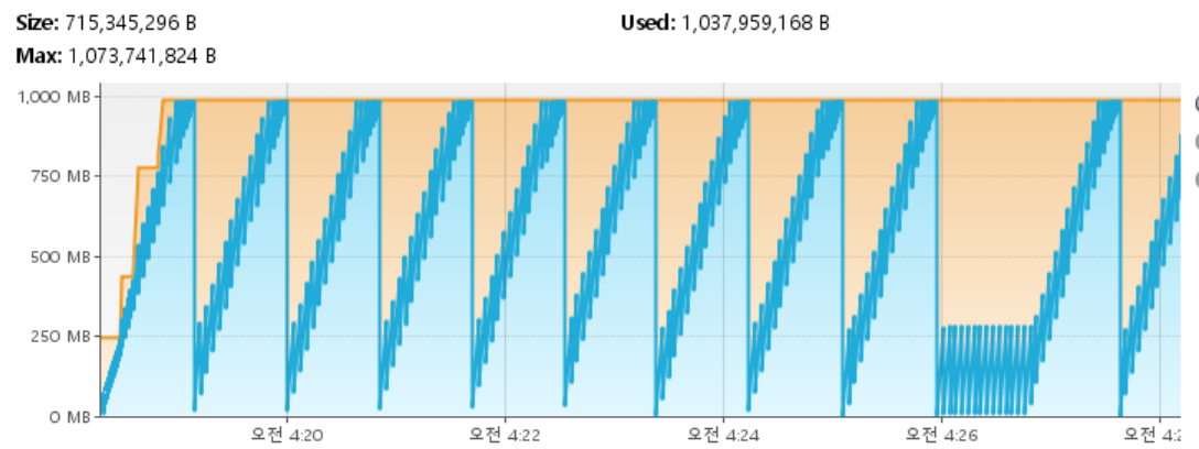 힙 메모리 파형을 보면 눈에 띄는 것은 G1GC이다. 위에 나온 GC 회수만큼 파형 간격도 좁다는 것을 알 수 있고,