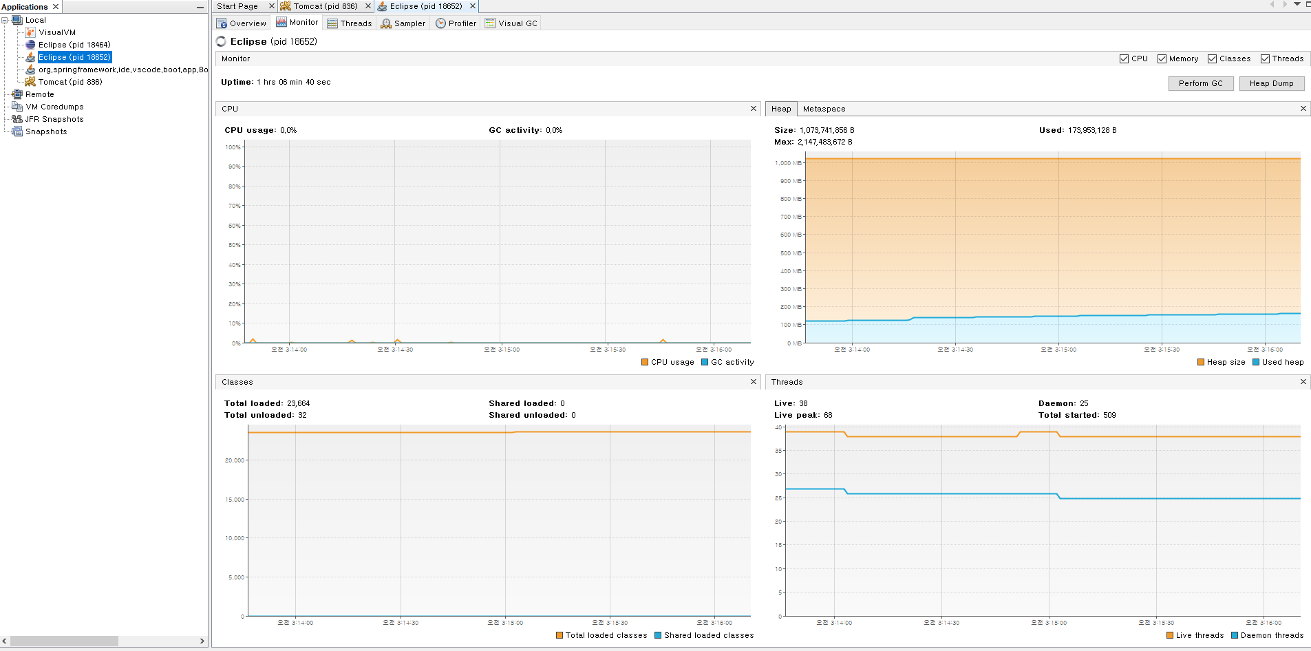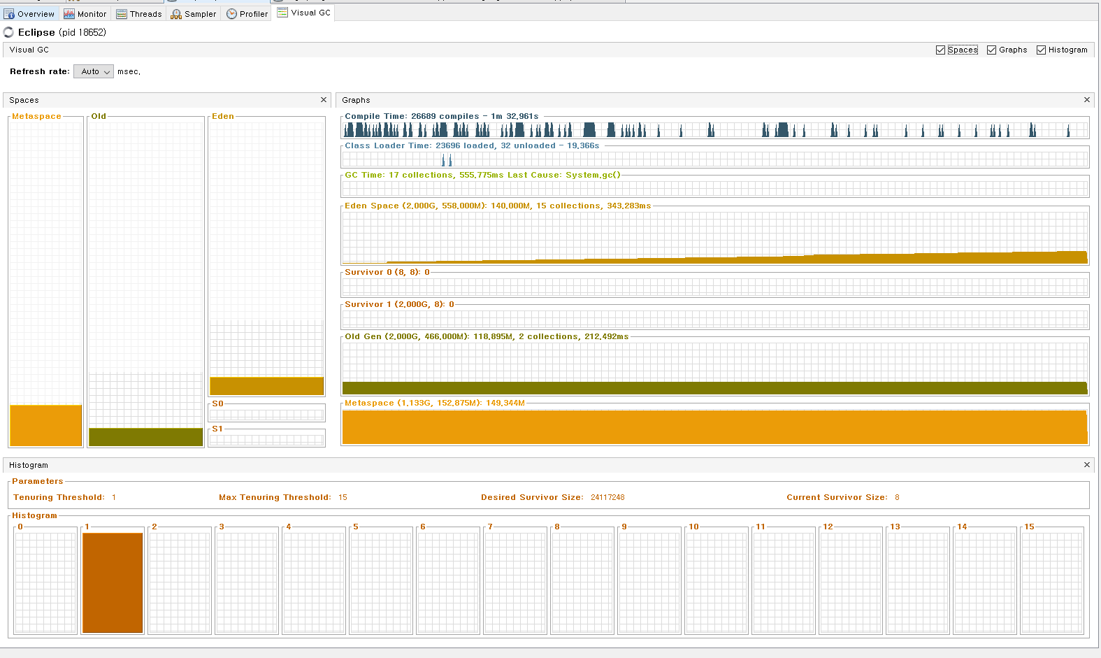 Visual GC를 킨 모습이다. Heap 영역에 대한 정보를 자세히 알 수 있고, GC Time에 대한 정보도 있어 유용하다.