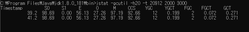 jstat 명령어 수행 jstat -gcutil -h20 -t processId 2000 3000