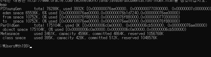 | gccapacity | 각 힙 영역의 최소크기(ms), 최대 크기(mx), 현재크기, 각 영역별 GC수행 횟수를 알 수 있는 정보를 보여준다. 단 현재 사용량과 누적GC소요시간은 알 수 없다. |