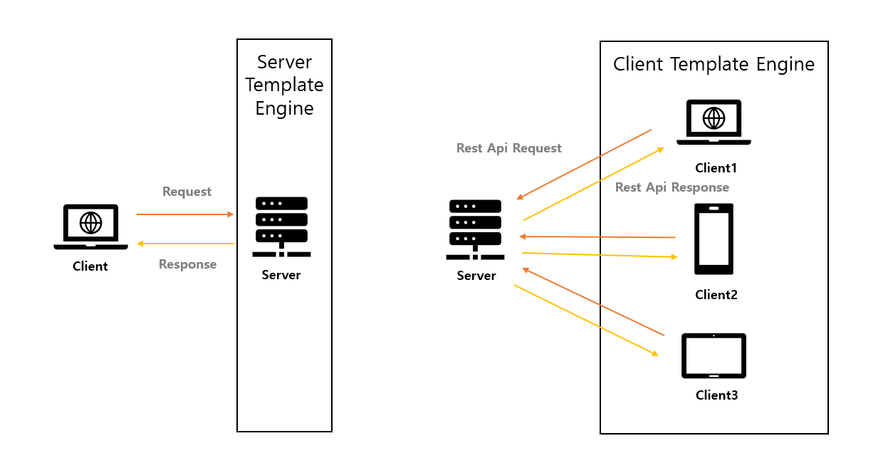 템플릿 엔진은 서버 사이드와 클라이언트 사이드로 나눠지게 된다.