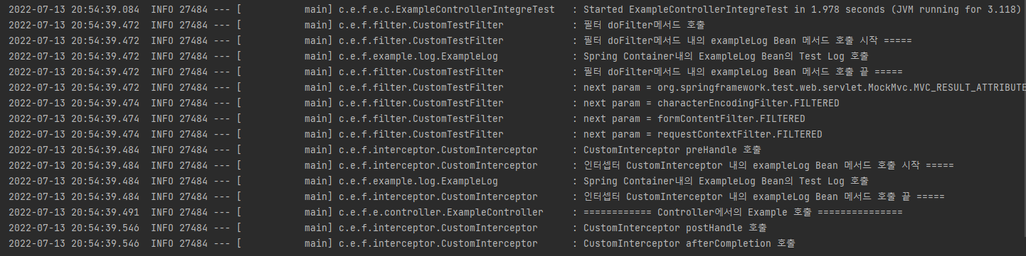log.info("인터셉터 CustomInterceptor 내의 exampleLog Bean 메서드 호출 끝 =====");