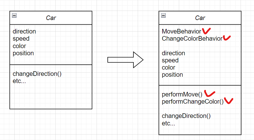 Car는 MoveBehavior와 changeColorBehavior를 가지고 있고, 각각으로 부터의 행동을 위임받습니다.