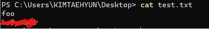 이어서 echo명령어로 test.txt를 생성하였으면 다시 cat .\test.txt 명령어로 내용이 들어있는지 확인해보자.