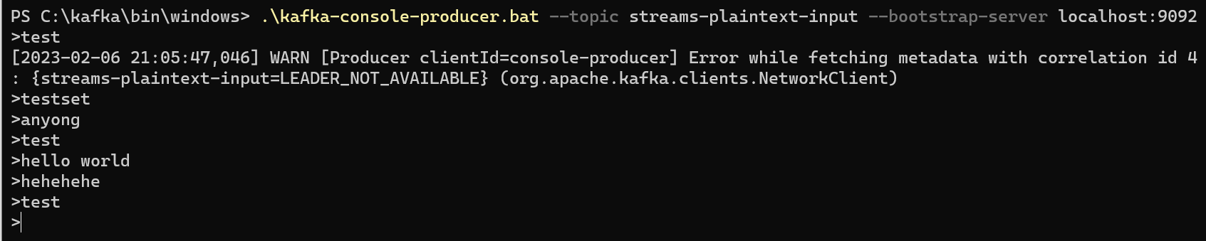 /kafka-console-producer.bat --bootstrap-server localhost:9092 --topic streams-plaintext-input