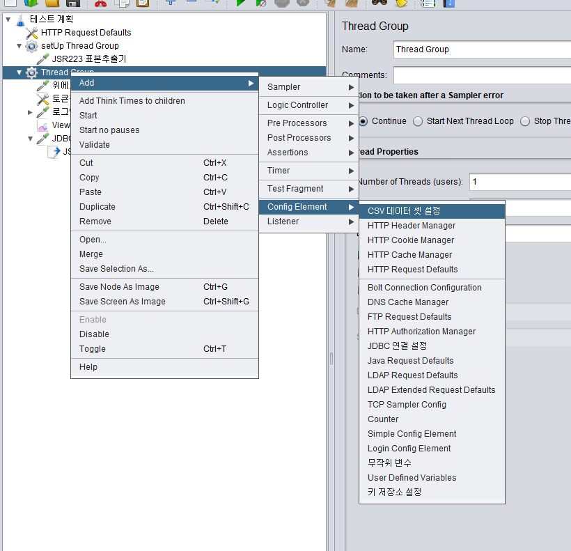 이 기본값 설정은 테스트계획 바로 아래에 존재해도되며, 상황에따라서 쓰레드 그룹 안으로 넣어도 괜찮다.