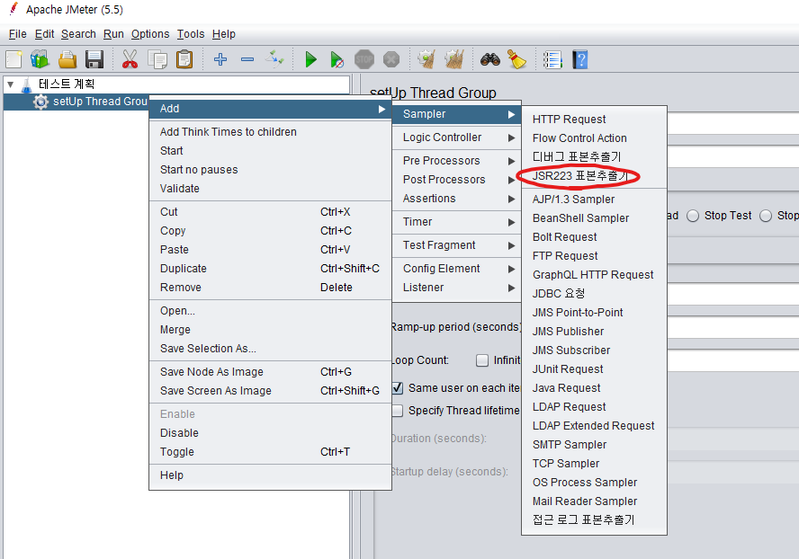 setUp Thread 그룹에서 JSR223 Sampler를 선택한다.