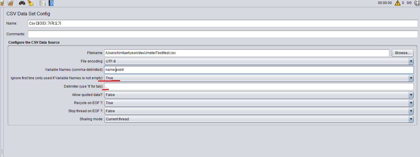 주의할것이 있다. 첫번째 빨간줄은 첫번째 열은 무시할거냐 (name, point)와 같은 변수명 => True