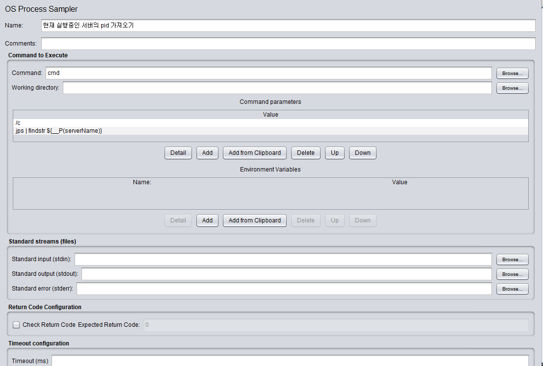 원래는 스크립트 한번에 처리할 수도 있지만 공부겸 2개의 OS ProcessSampler를 생성하였다.