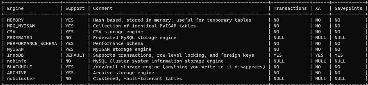 를 통해 MySQL 서버(mysqld)에서 지원되는 스토리지 엔진을 확인할 수 있다.