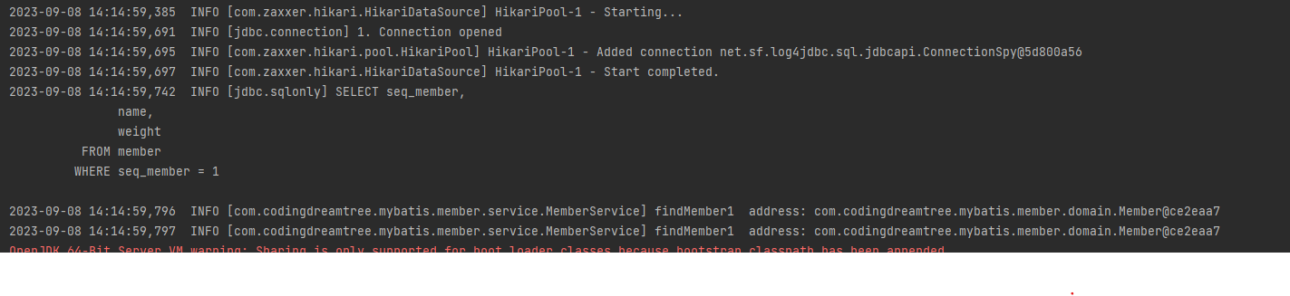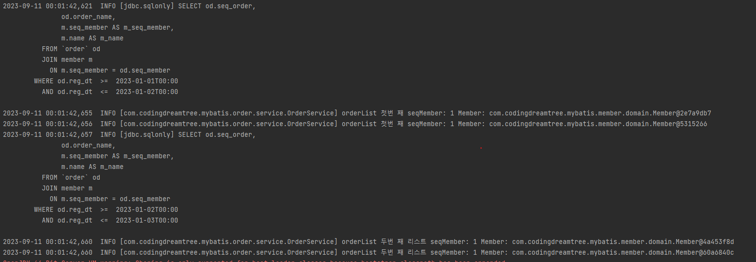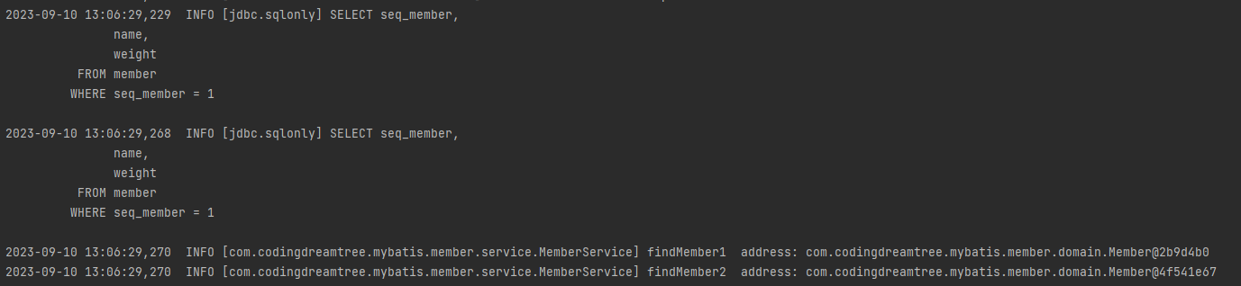 캐싱 내용이 초기화되어서 쿼리를 한번 더 호출하고, 인스턴스가 나뉜 것을 확실히 알 수 있다.