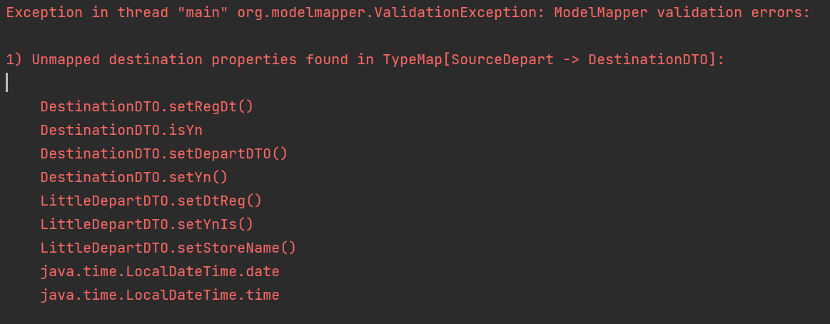 다음과 같은 에러를 띄워줘서 어떠한 값들이 매핑이 안되는지 알려주게 된다. (예외도 발생)
