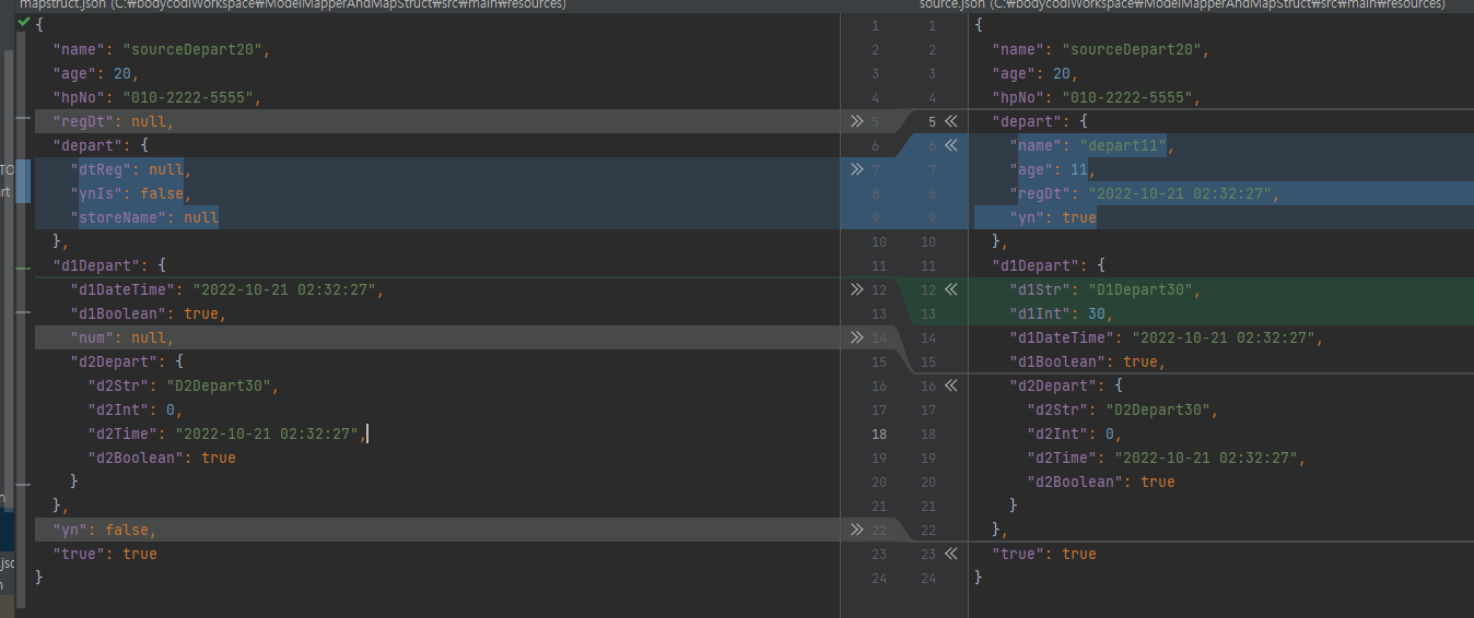 위에는 Mapstruct 결과물을 출력하였고, 밑에는 ModelMapper와 비교할 수 있게 같은 테스트를 작동시켰다.